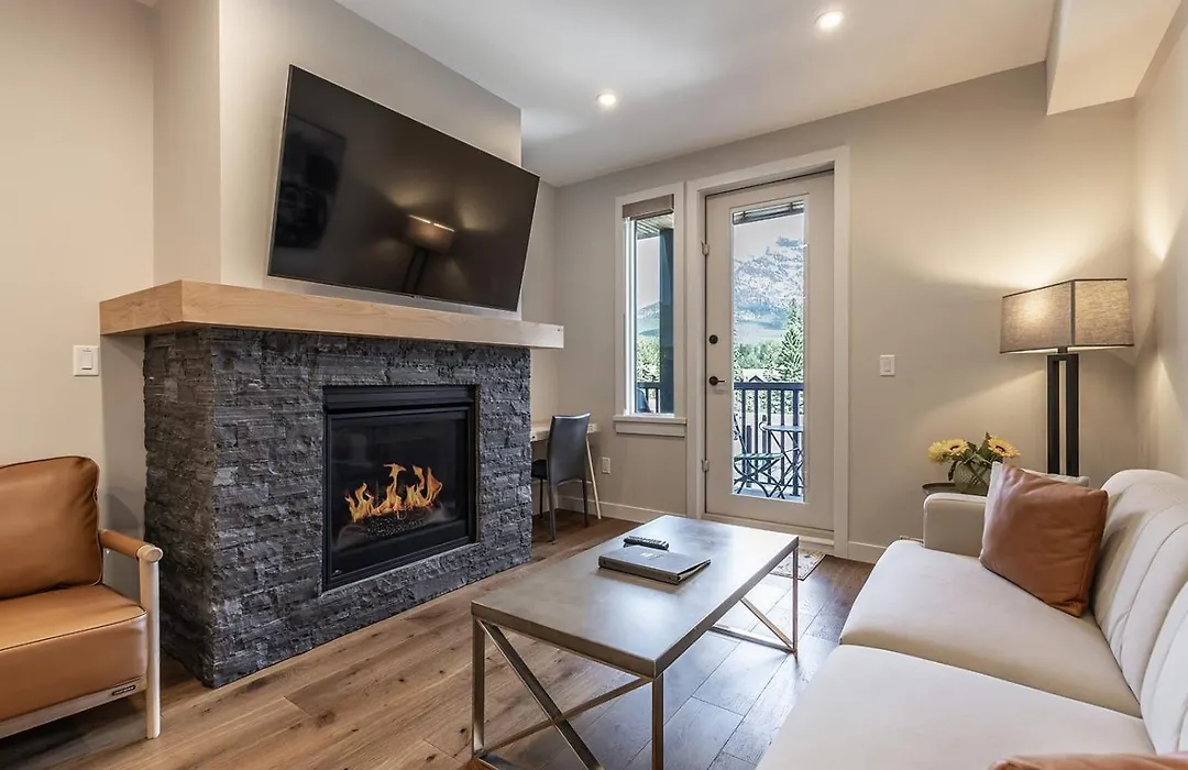 The interior of New 1Bd Luxe King Suite With Superb Mtn View features a stone fireplace furnished with a sofa set and a work desk. The property also includes media amenities such as high-speed internet and a television, allowing guests to unwind at their leisure. A bathroom comes with a separate toilet and a shower, along with a hair dryer and dressing gowns.